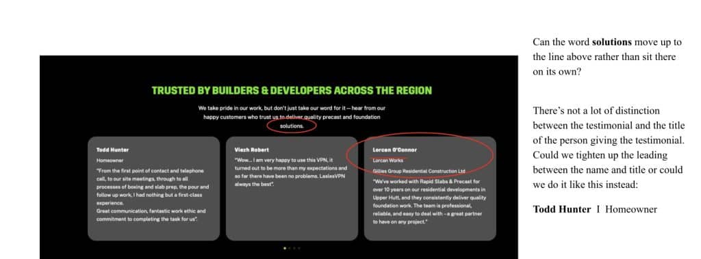 Other times you may have a question or be unsure which version is better. Take a look at this image – the top remark is a simple instruction to make a change. The lower one makes it clear what the end result the client wants – more distinction between the job title of the person and their name – but the client wasn’t sure exactly how to achieve this.
