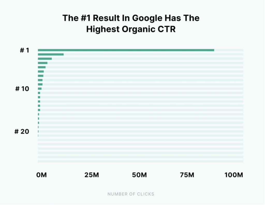 Although an uphill task, it’s worth pursuing because a top position in the search results supports higher organic click-through rates (CTR). The distribution of clicks on average are: